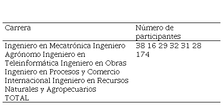 Los sujetos que participaron en el estudio fueron 174 alumnos de primer curso del Centro Universitario de la Costa Sur. Este es uno de los 15 Centros Universitarios que componen la Red Universitaria de la Universidad de Guadalajara, México. En él se imparten 6 carreras de ingeniería (véase Tabla 1), que representan la totalidad de la oferta educativa de orientación científico-tecnológica que se ofrece en esta institución educativa.