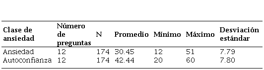 El instrumento administrado fue, pues, un cuestionario tipo Likert, formado por un total de 24 ítems, 12 ítems para ansiedad y 12 para autoconfianza. Cada uno de los ítems tiene cinco posibilidades de respuesta, que van de “totalmente en desacuerdo” a “totalmente de acuerdo”, así mismo se incluyó una respuesta central o neutra correspondiente a “ni de acuerdo ni en desacuerdo”.