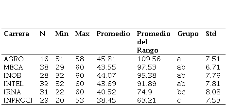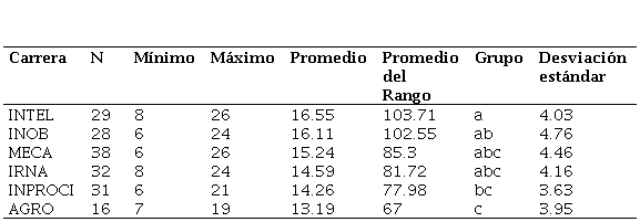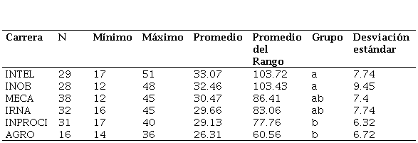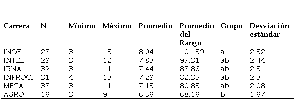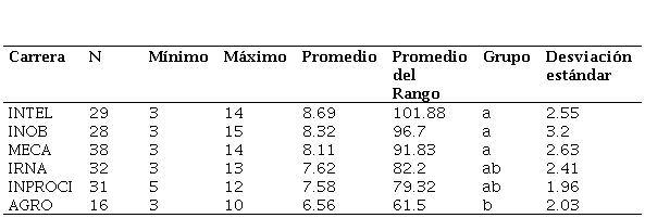 Fuente: Elaboración propia.En cuanto a la ansiedad hacia la resolución de problemas, como vemos en la Tabla 6, las carreras de INOB e INTEL reúnen estudiantes que obtienen valores muy próximos al valor máximo posible (15). Efectuando la prueba de Kruskal-Wallis a un nivel de significancia del 0.05, no se encontraron diferencias significativas entre los promedios de los rangos de las carreras, presentando todas ellas una tendencia positiva.