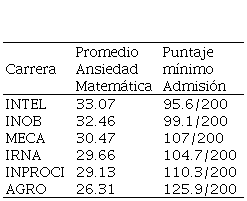 La carrera con el promedio de ansiedad más alto es la de Ingeniero en Teleinformática, algo hasta cierto punto lógico al tratarse de la carrera que presentó el menor puntaje de admisión de todas las carreras participantes, si tomamos en cuenta que posiblemente los estudiantes de esta carrera tengan deficiencias en su preparación académica de matemáticas, obtenida cuando cursaron los diferentes cursos de matemáticas en los niveles educativos anteriores a la universidad. Esta consideración estaría basada en el hecho de que para calcular el puntaje de admisión a la universidad se considera como el 50% el promedio obtenido en el bachillerato y el otro 50% son los puntos obtenidos en la prueba de admisión, la cual está integrada por un alto contenido de problemas de matemáticas. Para ser más específicos, mientras más bajos sean los puntajes de admisión que tienen los estudiantes, más bajos promedios obtuvieron en el bachillerato. A este respecto, la carrera que presentó menor promedio de ansiedad fue la de Ingeniero Agrónomo, siendo esta la carrera con mayor puntaje mínimo de admisión. A su vez, los estudiantes de esta carrera han sido los que han manifestado menores índices de ansiedad. Por tanto, podemos inferir que un puntaje bajo en la prueba de admisión a la universidad lleva asociados altos niveles de ansiedad, y viceversa, un alto puntaje de admisión va acompañado de bajos niveles de ansiedad.
