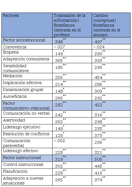 Referente a los vínculos existentes entre los factores de la competencia autopercibida docente (socioemocional, comunicativo-relacional e instruccional) y los enfoques de enseñanza (enfoque centrado en el profesor y en el alumno), uno de los hallazgos principales es que existen mejores correlaciones entre los factores de la competencia autopercibida docente y el factor Cambio conceptual/enseñanza centrada en el alumno. Ello es indicativo de que cuanto mayor sea el enfoque centrado en el alumno, mayor será la competencia autopercibida, si bien la competencia autopercibida correlaciona con el enfoque centrado en el profesor, la fuerza de relación es menor.