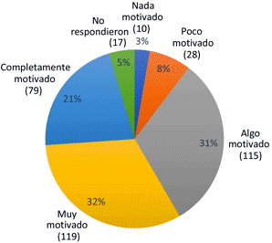 Dado lo anterior, uno de los cuestionamientos fue conocer si los y las estudiantes se sentirían motivados/as a realizar actividad física y deporte dentro del ICB, ello como una forma de asegurar espacios cercanos y tiempos de desarrollo. Así, un 84% respondió positivamente entre las opciones de completamente motivado, muy motivado y algo motivado, mientras que un 11% señaló estar entre poco y nada motivado (Figura 2).