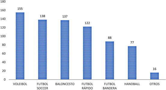 Como se observa en la Figura 4, respecto a las disciplinas de actividad física, defensa personal fue la más mencionada con 166 reacciones, seguida de pesas con 119, y posteriormente la actividad de gimnasia con 118; mientras que respecto a las disciplinas deportivas (Figura 5), el voleibol fue el más mencionado con 155, posteriormente el futbol soccer con 138 y luego el baloncesto con 137. Conviene señalar que, de las disciplinas con mayores menciones, de las tres áreas (fitness, física y deportiva), solamente pesas, futbol y baloncesto son actividades instituidas en la universidad para toda la comunidad universitaria, la primera como eje del complejo deportivo, y las segundas actividades que se desarrollan en torneos intramuros además de ser parte de las actividades con equipos representativos de alto rendimiento, mientras que las disciplinas de fitness son parte de la reciente dinámica juvenil-adulto.