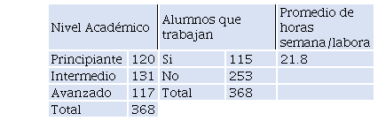 Otro dato importante es la ocupación alterna de los y las estudiantes, al contar la UACJ con una oferta de materias flexible, ubicada tanto en horario vespertino como matutino, así como la necesidad de muchos de ellos/as, permite a diversos estudiantes administrar en sus tiempos horarios para estudiar y trabajar. De la muestra, el 31.3% trabaja y el 68.7% solo se dedica a estudiar; quienes trabajan dedican en promedio 21.8 horas a la semana a dicha actividad (Tabla 2).