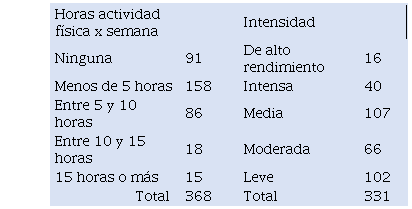 Ciertamente, del tiempo entre trabajo y estudio, o solo estudio, es importante la dedicación a actividades recreativas (Tabla 3). En ese aspecto, un cuarto de las personas encuestadas no realiza actividad física (24.7%), mientras que el 42.9% lo hace dedicándole menos de 5 horas por semana. De quienes realizan una actividad física semanal con mayor frecuencia, solo un 4.1% lo hace 15 horas o más, un 4.9% de 10 a 15 horas, y un 23.4% dedica entre 5 a 10 horas por semana. Por otro lado, 331 estudiantes respondieron a la pregunta acerca del nivel de intensidad con que hacen su actividad física, en la cual el nivel medio fue el más mencionado (32.3%), seguido del nivel leve (30.8%), mientras que los niveles de alto rendimiento (4.8%) e intenso (12%) fueron los menos referidos como el tipo de intensidad habitual en su actividad física por parte del estudiantado.