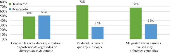 Al considerar lo anterior, se muestra que 51% de los estudiantes no cuenta con la información necesaria para tomar una decisión asertiva; no obstante, 73% de los participantes refieren que ya decidieron por una carrera a pesar de no contar con la información pertinente. Con base en esto se infiere que los estudiantes han tomado una decisión de manera desinformada y sin una planificación (ver Figura 2).