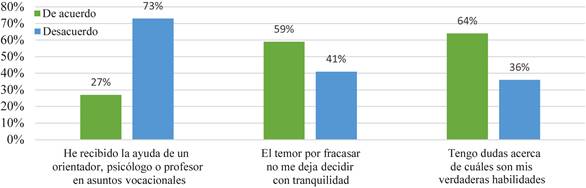 En cuanto a las habilidades, 64% de los participantes reporta incertidumbre sobre sus verdaderas habilidades, puesto que el tema de acompañamiento para el descubrimiento de estas y la atención sobre la incertidumbre experimentada por los alumnos es un aspecto que tendría que ser atendido por la figura del orientador, psicólogo o profesor. Sin embargo 73% de los participantes reportan no haber recibido apoyo de ninguna de estas figuras; en consecuencia 59% experimenta temor por fracasar, desembocando en dificultad para decidirse por una carrera (ver Figura 3).