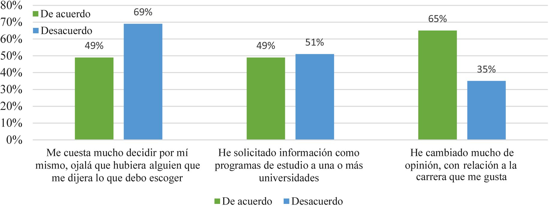 A pesar de que 64% de los estudiantes reporta que tiene autonomía para tomar decisiones por su propia cuenta, 51% señala que no se ha informado sobre las características de la carrera que le interesa. Al tomar en cuenta que dichos estudiantes tienen la seguridad de tomar decisiones vocacionales por su cuenta, pero sin informarse previamente, esto podría desembocar en incertidumbre o indecisión a causa de la falta de información, como es el caso del 65% de los estudiantes (ver Figura 1).