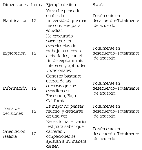 Se utilizó el cuestionario diseñado por Busot (1995) denominado Inventario de madurez vocacional, el cual se integra por 60 ítems divididos en cinco dimensiones que se fundamentan en la teoría de madurez vocacional (Super, 1955). El cuestionario originalmente está conformado por opción de respuesta dicotómica (Sí/No). Para su aplicación en el contexto de la educación media superior se modificó la opción de respuesta por una escala de Likert de seis niveles, que va de 1 como valor mínimo a 6 como valor máximo (1: Totalmente en desacuerdo, 2: En desacuerdo, 3: Poco en desacuerdo, 4: Poco de acuerdo, 5: De acuerdo, 6: Totalmente de acuerdo). Además, con el objetivo de contextualizar la redacción de los reactivos, algunos de ellos se modificaron en su estructura sintáctica (ver Tabla 1).