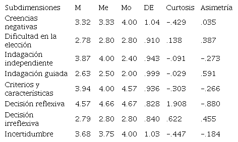 Por otra parte, en la Tabla 2 se describen los análisis de frecuencia de cada subdimensión resultante del análisis de validación de constructo. Destaca la subdimensión “Creencias negativas”, mediante la cual se identifica que los estudiantes visualizan una trayectoria académica difícil en la universidad ya que cuentan con poca claridad sobre sus intereses vocacionales. La subdimensión “Dificultad en la elección” indica que los participantes no evaden la responsabilidad de elegir por ellos mismo y de manera autónoma. La subdimensión “Indagación independiente” indica que los participantes se informan de manera independiente sobre las carreras y las profesiones, ya que se acercan por su propia cuenta a las instituciones o centros de trabajo para solicitar información.