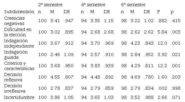 Mediante el análisis post hoc de Scheffe se identificó la diferencia entre los grupos (semestres que cursan los participantes), en cuanto a la subdimensión “Dificultad en la elección” se identificó que los estudiantes de 4º semestre reportan mayor autonomía para decidir por una carrera universitaria puesto que prefieren tomar la responsabilidad de elegir por ellos mismos; en comparación con los estudiantes de 2º y 6º semestres, en quienes se identifica menor autonomía para elegir.
