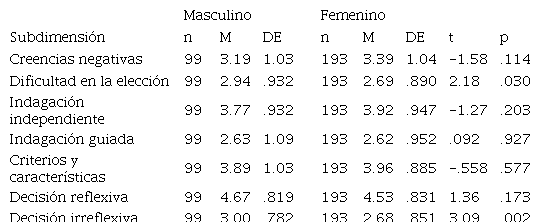 En cuanto a la subdimensión “Dificultad en la elección”, los participantes que se identifican con el género masculino reportan mayor autonomía que las participantes que se identifican con el género femenino para decidir por una carrera universitaria por ellos mismos. La subdimensión “Decisión irreflexiva” permite identificar que los participantes que se identifican con el género masculino se perciben más irreflexivos en cuanto a las decisiones vocacionales, puesto que refieren la toma de decisiones impulsivas relacionadas con lo vocacional o laboral, así como se identifica que son menos flexibles al no considerar segundas opciones de carreras universitarias.