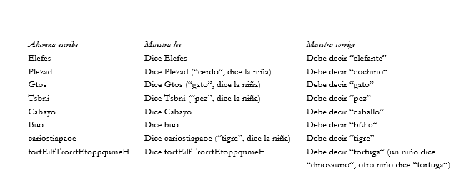 El Libro del maestro de Español de primer grado propone el dictado de palabras de nombres de animales que incluye sílabas simples y sílabas complejas, con el propósito de enfrentar al estudiante “al problema de pensar y decidir cómo es la representación escrita del nombre de los animales: ¿qué letras usar?, ¿cuántas?, ¿dónde?, ¿en qué orden?” (SEP, 2018, p. 63), como parte de la evaluación diagnóstica que ayude al profesorado a conocer el nivel de lectura y escritura del alumnado. Se desea que el niño encuentre el significado de las palabras, así como la interrelación de lenguaje, pensamiento y habla, necesaria para el desarrollo del pensamiento y el lenguaje en contextos socioculturales. De esta manera, se espera que el alumnado paso a paso llegue a la formación del concepto a través de agrupamientos sincréticos atribuyendo las primeras aproximaciones al significado de palabras, pasando por una organización del campo visual de manera sincrética, para después apoyarse en una base más compleja donde participan diferentes niños (Vygotsky, 2015); lo que significa realizar una enseñanza diferente a la repetición, mecanización y dictado de palabras de nombres de animales con motivo de examen.