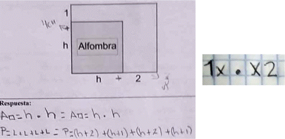 En términos generales, para el grupo de los 26 estudiantes la letra no representa el nombre del lado de la alfombra, sino que representa un número en general; aunque en el trabajo matemático que muestran alguno de ellos es necesario analizar algunas situaciones en relación al uso de signos matemáticos y de habilidades algebraicas. Por ejemplo, en este grupo de respuestas se encuentra que, para expresar el producto notable, hay ausencia de los signos de agrupación (uso de paréntesis), errores algebraicos, como por ejemplo el de M18I, en el que olvida colocar el término lineal de la literal. Ella escribe “h2 + 3 + 2”. Omite colocar 3h.