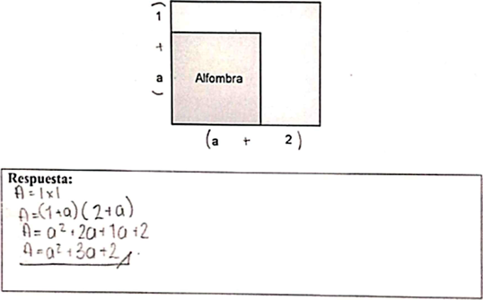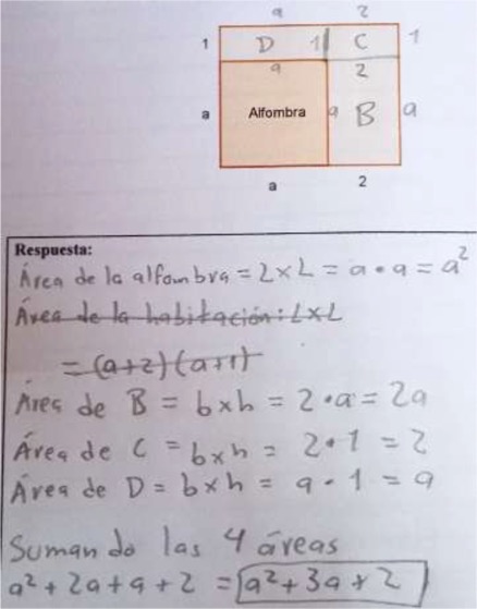De los 26 estudiantes de nuevo ingreso a la universidad, licenciatura de Ingeniería, que le otorgaron el significado esperado para el éxito de la tarea, es decir, el de número generalizado, se puede identificar dos posibles rutas cognitivas. La primera ruta, la cual fue seguida por la mayoría de estos estudiantes, corresponde a identificar las longitudes del rectángulo que determinan el área de la habitación. Esta actividad de transformación entre la figura geométrica y la escritura algebraica va acompañada o no por un trabajo algebraico que transforma la escritura solicitada. Para ello acudieron a algoritmos o al reconocimiento de un sentido estructural, entendiéndose esto como la habilidad para hacer un uso eficiente de técnicas algebraicas aprendidas (Vega et al., 2012). En este caso corresponde a la manera en que desarrolla el producto notable; es decir, si para desarrollar el producto notable utiliza el patrón conocido (x + a)(x + b). La segunda ruta corresponde a encontrar el área a través de la descomposición en pequeñas áreas, es decir, el área de la alfombra, más las áreas que no se alcanzaron a cubrir con la alfombra.