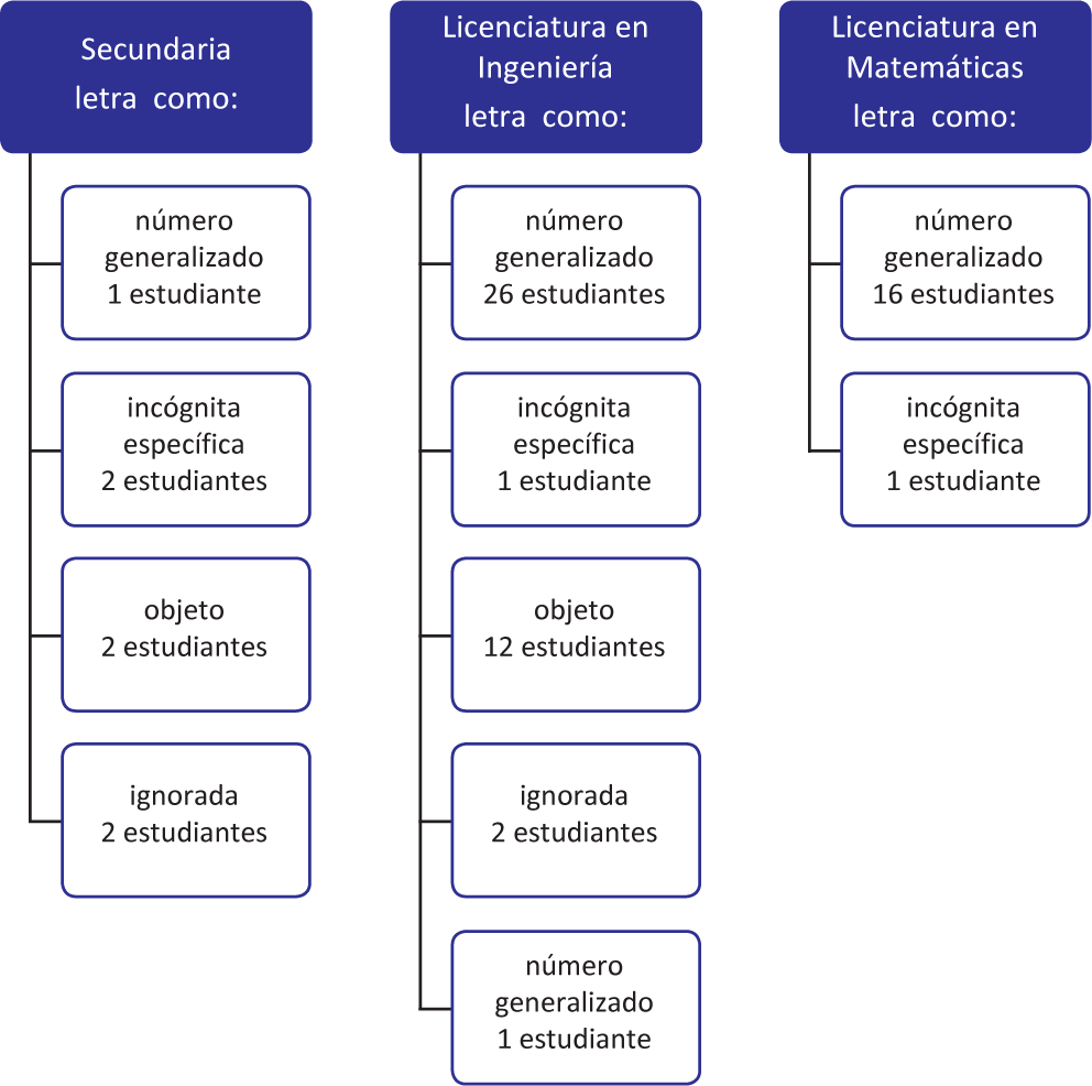 En síntesis, los significados identificados en el trabajo de los estudiantes a la letra . son cuatro, letra ignorada, objeto, número general e incógnita específica, siendo este último significado el de mayor frecuencia, tal vez porque las ecuaciones se conforman en un pilar para la construcción de otras nociones matemáticas en el nivel secundaria (Pérez et al., 2019), por lo que puede constituirse en el significado de las literales más potenciado dentro del currículo matemático mexicano, presente también en resultados con docentes en formación (Aké, 2019).