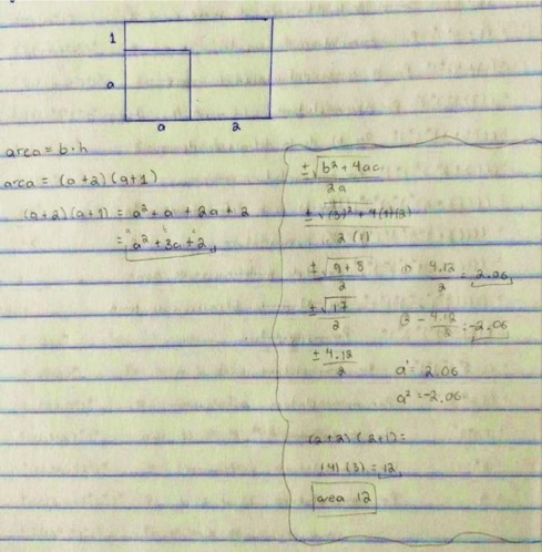 Finalmente, el estudiante H4S le otorga el significado de letra como número generalizadosin que su trabajo sea del todo exitoso. El estudiante identifica la x como longitud de la alfombra y representa el área relacionada proporcionando la expresión “x2 + 2x + x”. Su trabajo muestra que descompone en áreas; sin embargo, no logra asociarlas de manera correcta.