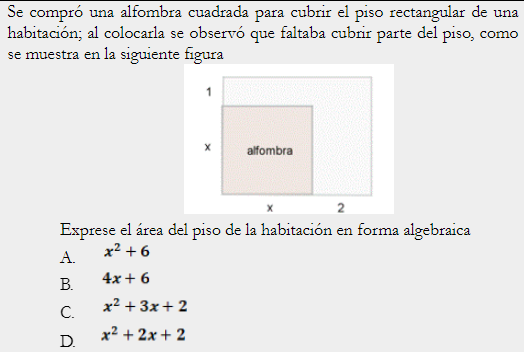 La tarea fue tomada de la investigación de Castro y Hernández (2018), donde se evidencian los errores de estudiantes de tercero de secundaria al responder diferentes ítems del examen estandarizado Planea (Plan Nacional para las Evaluaciones de los Aprendizajes) del 2016 (INEE, 2016b), específicamente en el eje de “Sentido numérico y pensamiento algebraico” (SNyPA). Aunado a lo anterior, el Manual para la aplicación, calificación, análisis y uso de los resultados de la prueba Planea (INEE, 2016a) presenta la clasificación de este tipo de ítems ubicándolos en la unidad de análisis que evalúa los aprendizajes matemáticos relacionados con los significados y usos de las literales y como uno de sus descriptores “identificar expresiones algebraicas a partir de un modelo geométrico”. Por tal motivo se eligió el ítem que era acorde a la problemática de interés, relativa al significado de las literales que el estudiante otorga a su resolución. Este ítem es de opción múltiple, y su enunciado se muestra en la Figura 1.