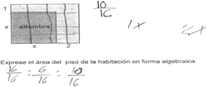 De los 14 estudiantes, solo 8 responden. Dos estudiantes (H1S y H6S) le otorgan el significado de letra ignorada. Ellos pasan por alto la x, y en su lugar realizan una aproximación del valor del área utilizando métodos aprendidos en los primeros años de estudio. En el análisis del trabajo matemático de H1S, que se muestra en la Figura 2, se evidencia que en la transformación que realiza la unidad significante que tiene peso corresponde a la figura geométrica del cuadrado y los valores numéricos que en la representación geométrica del ítem se muestran. Extiende la forma geométrica del cuadrado que corresponde a la alfombra a toda la habitación; es decir, no hay un reconocimiento de la figura que corresponde al piso de la habitación como un rectángulo. La actividad matemática de los dos estudiantes es muy similar y su punto de partida corresponde a dividir el rectángulo en partes iguales, suponiendo que corresponde a un cuadrado, basándose para ello en la unidad establecida en uno de los lados (longitud 1). Estos dos estudiantes dividen en 16 secciones el piso de la habitación. Luego establecen tres razones matemáticas principales para ello. La primera razón (16/16) representa el área total de la habitación. La segunda razón (6/10) representa el área de la alfombra, y la última razón (10/16) representa el área del piso que no se cubre. Lo anterior a través de procesos aritméticos de cálculo de áreas mediante el proceso de cuadricular. Este trabajo de “aproximación” a través de una longitud conocida, es una estrategia que quizás hubiera podido funcionar en otras situaciones. Lo relevante de esta estrategia es que establece proporciones con las razones planteadas, mostrando así carencias conceptuales en relación a proporcionalidad, álgebra y geometría.