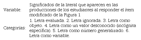 Estas categorías cumplen con las características establecidas por Bernete (2013) para corresponderse con los objetivos y el enfoque teórico aplicado en la presente investigación; es decir, son homogéneas, pues todas corresponden a un posible significado de las literales; son mutuamente excluyentes, dado que cada significado está claramente diferenciado en el modelo de Küchemann (1980), y son exhaustivas, considerando que los significados de las literales cubren todas las posibilidades que podrían aparecer en las respuestas esperadas en el ítem aplicado.