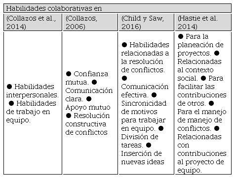 De acuerdo con Collazos et al. (2014), las habilidades blandas interpersonales y de trabajo en equipo son parte de los elementos básicos en cualquier entorno considerado como colaborativo, incluyendo el educativo. La confianza entre compañeros, la comunicación clara, el apoyo mutuo y resolución constructiva de conflictos son mencionadas en diversos trabajos (Collazos et al., 2014; Johnson y Johnson, 1994) como necesarias para la labor colaborativa. Por su parte, en Collazos (2006) se muestran a las habilidades para resolución de problemas y las habilidades de trabajo en equipo como habilidades para el trabajo colaborativo dentro del aula.