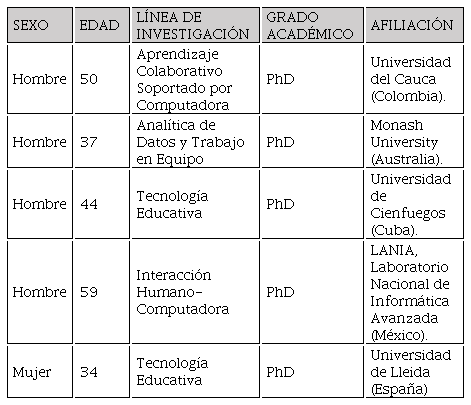 Pedrosa et al. (2013) mencionan que la selección adecuada del grupo de expertos es vital para este tipo de validez, por lo que es fundamental realizar un análisis previo sobre la experiencia y proyectos de los candidatos a participar en este proceso. Para la validación de TeamUp versión en español se contó con la cooperación de cinco investigadores expertos con publicaciones relevantes relacionadas al aprendizaje colaborativo y cuya lengua nativa es el español (ver Tabla 2). El objetivo de su participación fue la revisión y retroalimentación tanto de categorías como de dimensiones, así como de reactivos del instrumento aquí presentado, con base en los criterios de pertinencia, claridad, redacción y terminología, formato y escala.