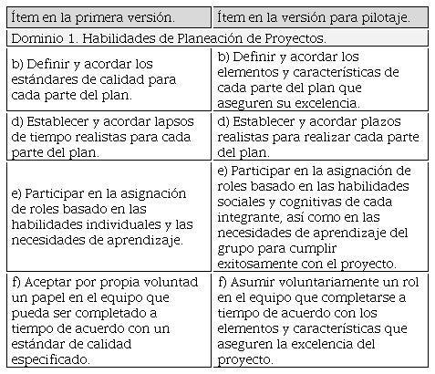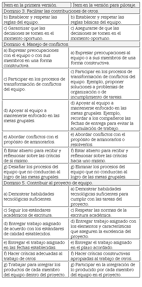 La validación por parte de los jueces expertos identificó elementos de la traducción posiblemente confusos o inadecuados para estudiantes en edad de cursar el bachillerato. Debido a esto, la rúbrica fue reajustada antes del proceso de pilotaje, donde gran parte de los cambios se enfocaron en puntualizar acciones que reflejen las actitudes deseables por parte de los estudiantes para un trabajo en equipo eficiente en un ambiente de aprendizaje colaborativo.