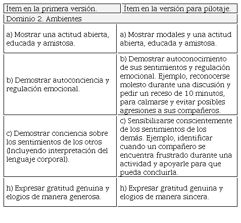 Con base en los comentarios realizados por tres de los jueces, el término “autoconciencia” presente en el dominio 3 fue reemplazado por la frase “autoconocimiento de sus sentimientos”, la cual es una definición con mayor afinidad a lo establecido en Parratt et al. (2016) y que se refiere a la capacidad del estudiante de reconocer sus emociones y así autorregularlas en situaciones donde encuentre elementos estresores durante el trabajo colaborativo. Además, dos expertos plantearon la necesidad de incluir ejemplos de comportamiento que evidencien regulación emocional en individuos y que, de esta manera, los estudiantes comprendan la actitud esperada por ellos (ver Tabla 5).