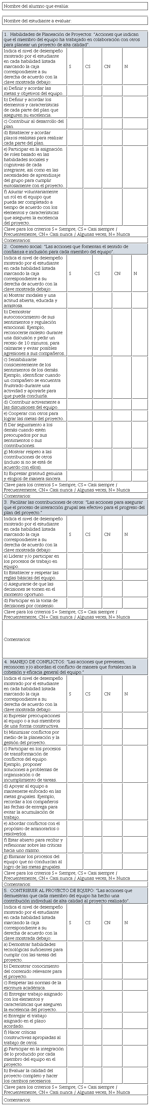 Este trabajo presenta el proceso seguido para adaptar y validar la versión en español de una rúbrica para el desarrollo y evaluación de habilidades de trabajo en equipo, mismas que son base para el óptimo desempeño dentro del aprendizaje colaborativo.