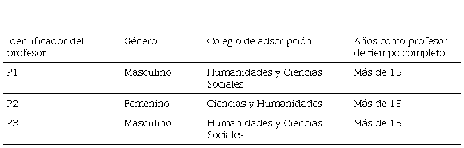 En la Tabla 1 puede observarse el perfil de los profesores, dos de ellos pertenecientes al Colegio de Humanidades y Ciencias Sociales y una al de Ciencias y Humanidades; todos con más de 15 años de permanencia en la universidad como profesores de tiempo completo.