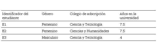 En la Tabla 2 se muestra el perfil de los estudiantes, dos de ellos pertenecientes al Colegio de Ciencia y Tecnología y una al de Ciencias y Humanidades. Los estudiantes E1 y E2 cuentan con 7.5 años en la universidad y el estudiante E3 con 4.