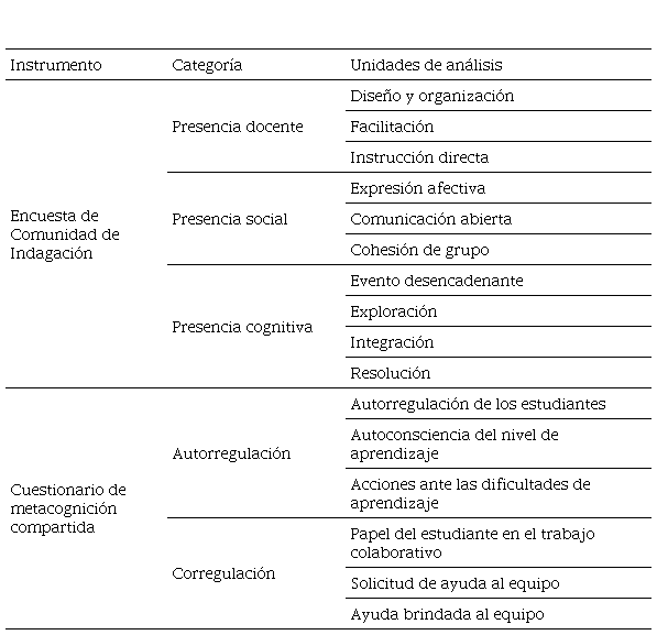 Las guías de entrevista se basaron en la síntesis y adaptación de los ítems de dos instrumentos desarrollados por los creadores del modelo de la CoI: la Encuesta de comunidad de indagación (Arbaugh et al., 2008) y el Cuestionario de metacognición compartida (Garrison y Akyol, 2015a; 2015b). Las categorías se muestran en la Tabla 3.