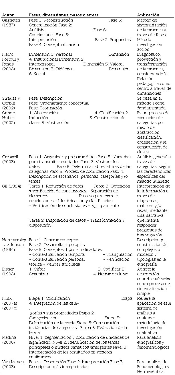 Estas clasificaciones propuestas de los autores señalados sobre las fases, dimensiones, pasos o tareas de la sistematización de la información cualitativa sugieren un proceso específico para realizar el análisis cualitativo en una investigación. La propuesta de Gagneten (1987) es más adecuada para estudios sobre la práctica, aunque puede ser aplicada a todas las metodologías cualitativas; el proceso sugerido por Fierro et al. (1999) se utiliza más para análisis de diagnóstico y/o de intervención didáctica o institucional; las aportaciones de Strauss y Corbin (2002), Huber (2002), Creswell (2003), Gil (1994) y Flick (2007a y 2007b) pueden utilizarse para cualquier metodología, especialmente en teoría fundamentada y estudio de caso; las de Eisner (1998) y Medina (2006) para aportes de etnografía y fenomenología.