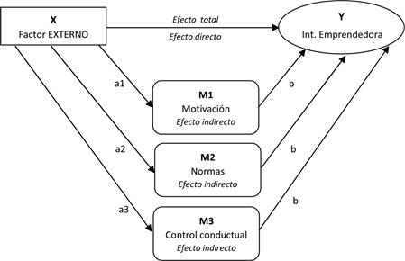 En el modelo de mediación simple del factor externo, con base en los resultados obtenidos podemos llegar a las siguientes conclusiones: no existe una relación directa del factor externo sobre la intención emprendedora, pero sí lo hace a través de cada una de las tres variables mediadoras del modelo de la TCP. La motivación y el control conductual son las dos variables mediadoras principales, mientras que la norma tiene un efecto muy pequeño.
