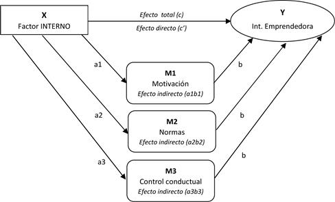 Se planteó que las variables creadas previamente y que hemos denominado factor externo y factor interno pueden ser predictoras de la intención empresarial, pero a través de la mediación de otras variables, que son las tres dimensiones de la teoría de la conducta planificada (TCP): motivación, normas y control conductual.