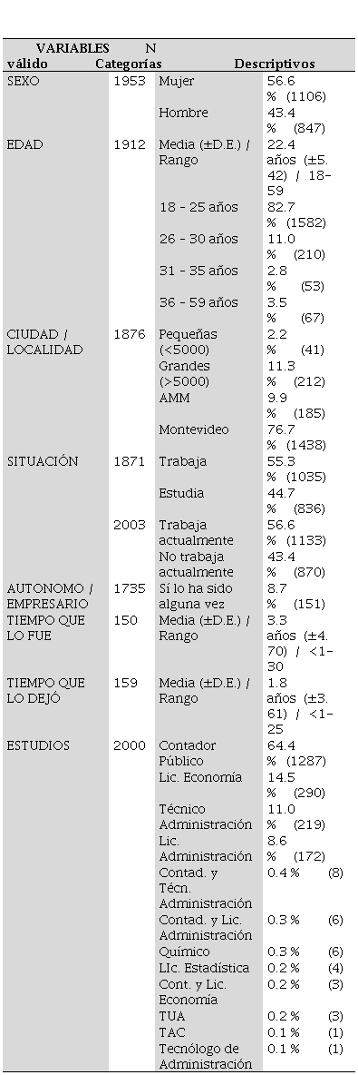 Los datos sociodemográficos que aparecen son: sexo, ciudad, experiencia laboral, si alguna vez estuvo autoempleado, profesión del padre y profesión de la madre.