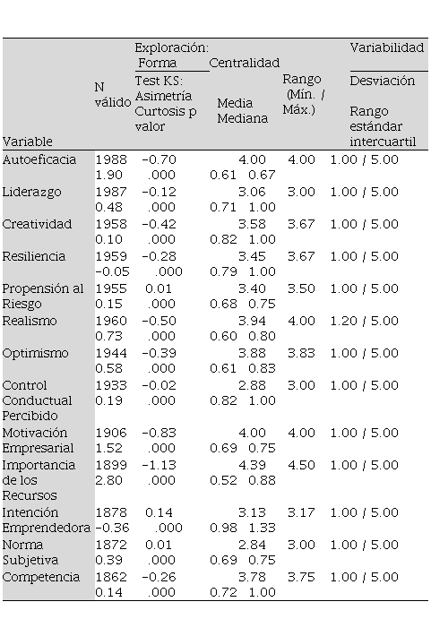 Luego de un primer análisis de la base de datos las variables fueron reagrupadas llegando a trabajar con 13 que eran las significativas: autoeficacia, liderazgo, creatividad, resiliencia, propensión al riesgo, realismo, optimismo, control conductual, motivación, recursos, intención emprendedora, norma subjetiva y competencia.