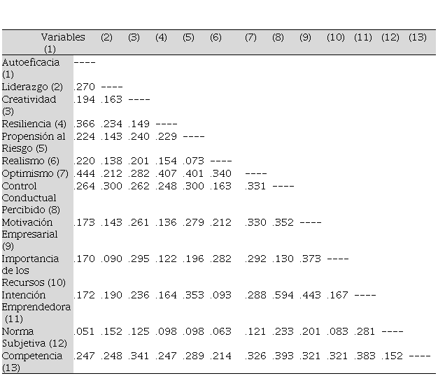 El resultado obtenido muestra que cada una de las variables de las dimensiones consideradas por sí solas predice en forma altamente significativa la intención emprendedora. La autoeficacia, la motivación empresarial y la importancia de los recursos son las variables con mayor predicción. La correlación entre las trece variables es positiva, entonces, una persona que presente todas las variables de las dimensiones consideradas cada una por sí sola es altamente predictora de la intención emprendedora, aunque la intensidad de las relaciones en la mayoría es leve. La variable norma subjetiva es la que menos correlaciones mantiene con el resto de las variables.