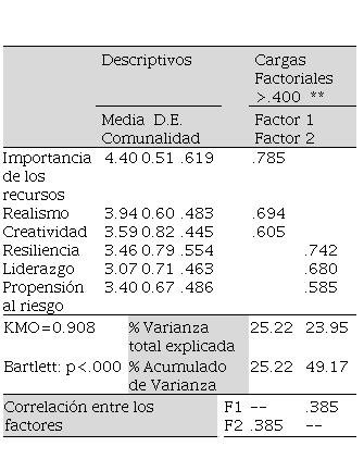Se ha empleado el método del análisis factorial (AF) para verificar si las dimensiones liderazgo, creatividad, resiliencia, propensión al riesgo, realismo e importancia de los recursos podrían agruparse en factores comunes de tipos interno y externo. En primer lugar se comprobó si se cumplían las condiciones de realización de este método estadístico.
