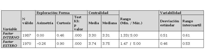 Calculadas estas variables, se procedió a su exploración y descripción con los procedimientos estadísticos antes empleados (apartado 3 de este informe). Los resultados que hemos obtenido (Tabla 6) nos indican: (1) tanto el histograma como el diagrama Q-Q normal nos muestran distribuciones claramente tendentes a la normalidad estadística, que se confirma por los valores de asimetría y curtosis que están dentro del rango admisible; esto nos lleva a aceptar la normalidad de las variables a pesar de la significación que aparece en el test de bondad de ajuste KS que se debe solo a lo elevado del N; (2) las distribuciones cubren gran parte del rango posible de valores [1-5], con medias algo por encima de los 3 puntos, algo más alta en el factor externo (3.74 versus 3.30) y con una variabilidad de alrededor de ± 0.50 puntos.