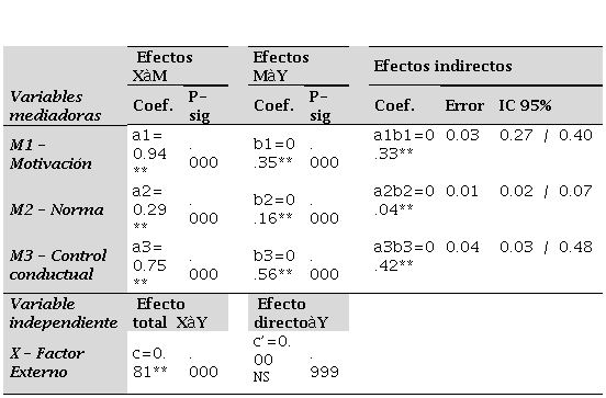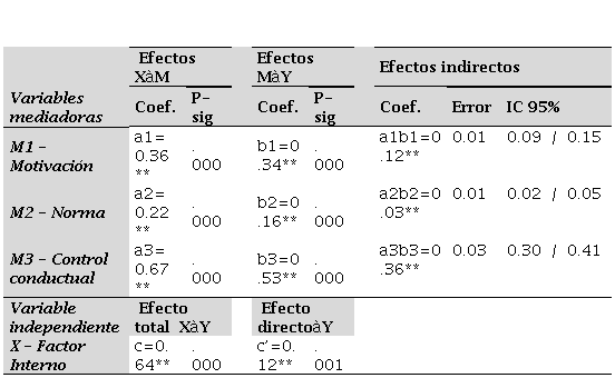 Con relación al orden de importancia en el efecto mediador de estas variables, la primera es el control conductual, con un efecto alto; la segunda la motivación, con un efecto medio, y la tercera, la norma, tiene efecto bajo.