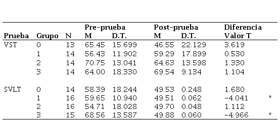 Del análisis anova, en la comparación del postest entre grupos se encontró efecto del entrenamiento sobre el puntaje de la prueba VST, (F(3, 50) = 4.536, p= .007, hp2 = 0.21, b = 0.86). La revisión post-hoc efectuada con Bonferroni encontró que los participantes del grupo 2 tuvieron una media mayor que los del grupo 0, (p = .035) IC 95% [0.84, 35.32], así como los del grupo 3 sobre el mismo grupo, (p = .006) IC 95% [4.96, 41.03]. De manera análoga, en el caso de la prueba SVLT, (F(3, 56) = 29.455, p < .001, hp2 = 0.61, b = 1.00), el análisis post-hoc mediante Bonferroni arrojó que los participantes del grupo 2 obtuvieron mejor media que los de los grupos 0 y 1, (p = .005) IC 95% [0.037, 0.291] y (p < .001) IC 95% [0.076, 0.301] respectivamente. De manera similar, los del grupo 3 consiguieron una media superior a los tres grupos: grupo 0 (p < .001) IC 95% [0.220, 0.486], grupo 1 (p < .001) IC 95% [0.258, 0.496] y grupo 2 (p = .001) IC 95% [0.065, 0.313].