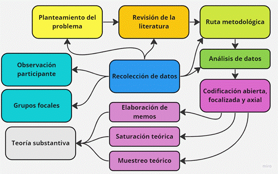 Decidimos circunscribir el estudio dentro de un enfoque cualitativo enmarcado en un diseño de teoría fundamentada constructivista (Charmaz, 2014), debido a que es un diseño de investigación ampliamente utilizado en las ciencias sociales (Sánchez-Suricalday et al., 2022). La teoría fundamentada es reconocida por su naturaleza cualitativa, cuyos fundamentos filosóficos se remontan al pragmatismo y al interaccionismo simbólico (Bryant, 2017). Por una parte, consideramos que la ruta metodológica se ajusta al objeto de estudio por el rigor que se le imprime a través del análisis de los datos por medio de codificación abierta, focalizada y axial. En conjunto, este enfoque garantiza la validez y confiabilidad de nuestra indagación cualitativa al facilitar la comprensión profunda del fenómeno investigado (Figura 1).