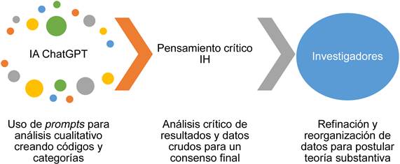 Por otra parte, la integración de la inteligencia artificial –IA–, en particular ChatGPT 3.5, en el proceso metodológico presenta una dimensión innovadora en la investigación cualitativa. La colaboración entre la inteligencia humana –IH– y la IA se revela como una estrategia emergente para fortalecer la interpretación de resultados. Esta combinación permitió unificar códigos, categorías e interpretaciones, contribuyendo a la coherencia y consistencia en el análisis (Burgos et al., 2023; Crawford et al., 2023; Diego et al., 2023; Kalla y Smith, 2023).
