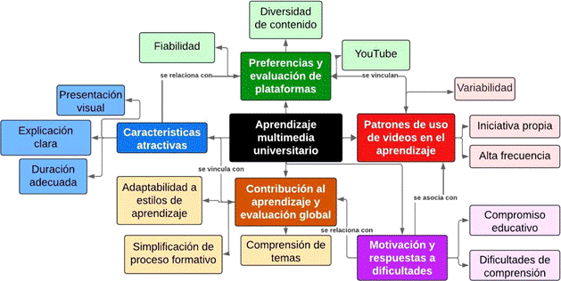 La categoría se construyó partiendo de los códigos características atractivas de un material multimedia y duración adecuada, mediante los cuales se destacan las particularidades para que un video sea atractivo y efectivo para el aprendizaje. En lo que concierne a las características atractivas de un material multimedia, se detallan elementos como la presentación visual, el uso de avatares y ejemplos. Por otra parte, la duración adecuada se centra en la longitud óptima que, aunque la tendencia está entre uno y cinco minutos, se puede extender hasta 15 o más, dependiendo del propósito del video y de las necesidades educativas o comunicativas. En tal marco, se interpreta que la preferencia por videos de duración corta sugiere una valoración del tiempo y la necesidad de mantener la atención del espectador.