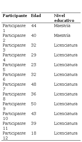 El muestreo recurrió a una estrategia intencional por bola de nieve (Cohen et al., 2018). Para tal efecto, se estableció contacto con estudiantes conocidos para que estos a su vez recomendaran a otros a participar en la investigación. En este sentido, se contó con un total de 12 participantes, M = 11 y H = 1, con un rango de edad entre los 18 a los 50 años. El estudiantado pertenece a programas de Licenciatura y Maestría en Educación de la UPES (Tabla 1). Los criterios de inclusión requirieron que 1) los estudiantes estuvieran inscritos en la UPES, 2) mostrar compromiso por su educación, 3) consultar videos en su proceso de aprendizaje y 4) haber sido recomendado por un estudiante conocido por el equipo de investigación. Por otra parte, se excluyó al alumnado por 1) no pertenecer a la UPES, 2) desinterés por su formación docente o 3) desinterés en la tecnología.