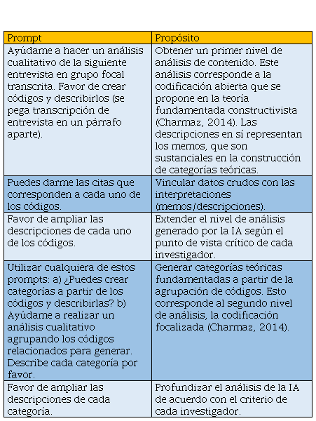 Subsiguientemente, durante el mes de noviembre, los tres investigadores utilizaron ChatGPT 3.5 con la finalidad de realizar un análisis de contenido con técnicas de teoría fundamentada (Lune y Berg, 2017). Para ello, las unidades de análisis textuales pasaron por un proceso de codificación abierta, focalizada y axial, de tal manera que el proceso de análisis y triangulación de interpretaciones permitiera postular una teoría substantiva, que es uno de los fines del diseño de la teoría fundamentada constructivista (Charmaz, 2014). En lo que concierne el empleo del software de IA, se recurrió al uso de distintos prompts, o instrucciones, para obtener los resultados deseados. En la Tabla 2 se comparten algunos de los prompts clave.