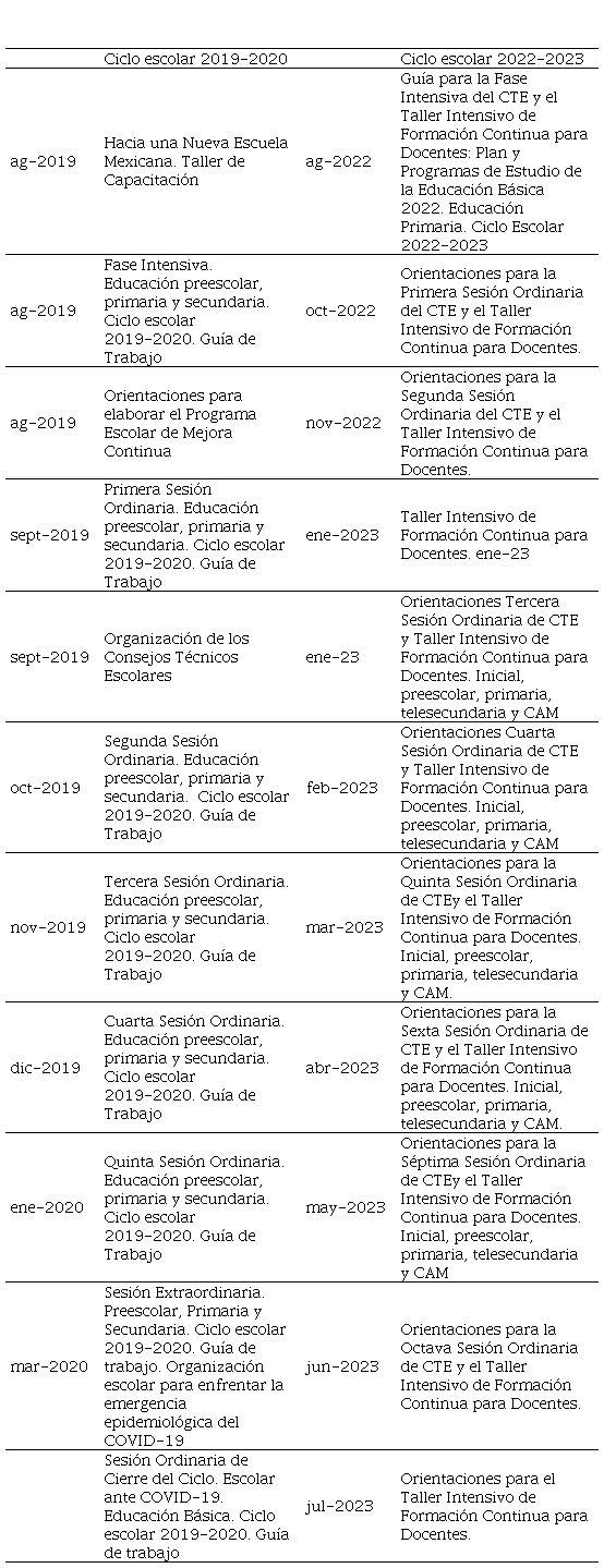 Particularmente, observamos que los insumos para CTE del ciclo escolar 2019-2020 sentaron las bases de la institucionalización de la nueva escuela mediante la socialización del marco curricular y del establecimiento de lineamientos para un tipo de gestión y organización escolar esperada. Por otra parte, durante el ciclo 2022-2023 los documentos acompañaron un proceso de formación, que tuvo como finalidad la apropiación del Plan de Estudio por parte del magisterio, el seguimiento del codiseño y la integración curricular, así como la construcción de los programas de trabajo.