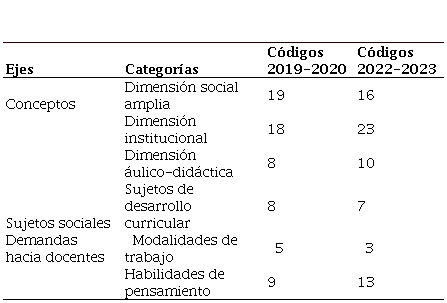 A partir del análisis cualitativo de contenido se establecieron ejes y categorías de manera deductiva e inductiva, en concordancia con las preguntas rectoras y el marco teórico expuesto. Como se observa en la Tabla 2, el eje “Conceptos” consta de tres categorías deductiva, el de “Sujetos” de una y el de “Demandas hacia docentes” se conforma por dos categorías inductivas. Asimismo, la conformación y cantidad de códigos, así como su agrupación en las categorías establecidas, respondió a un orden inductivo.