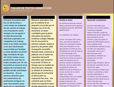 Esos primeros textos no cumplían en gran medida con las características de la minificción; aunque el docente envió ejemplos que se compartieron vía WhatsApp para que los y las estudiantes tuvieran un modelo para realizar la actividad, era necesaria la interacción entre ellos y que sus mismos textos fueran su modelaje, lo cual implicaba que esos ejercicios estuvieran a la vista de todos al mismo tiempo. Por las razones anteriores, el docente decidió utilizar Padlet como medio para ejemplificar y trabajar con el estudiantado la escritura de minificciones, así como la retroalimentación entre pares.